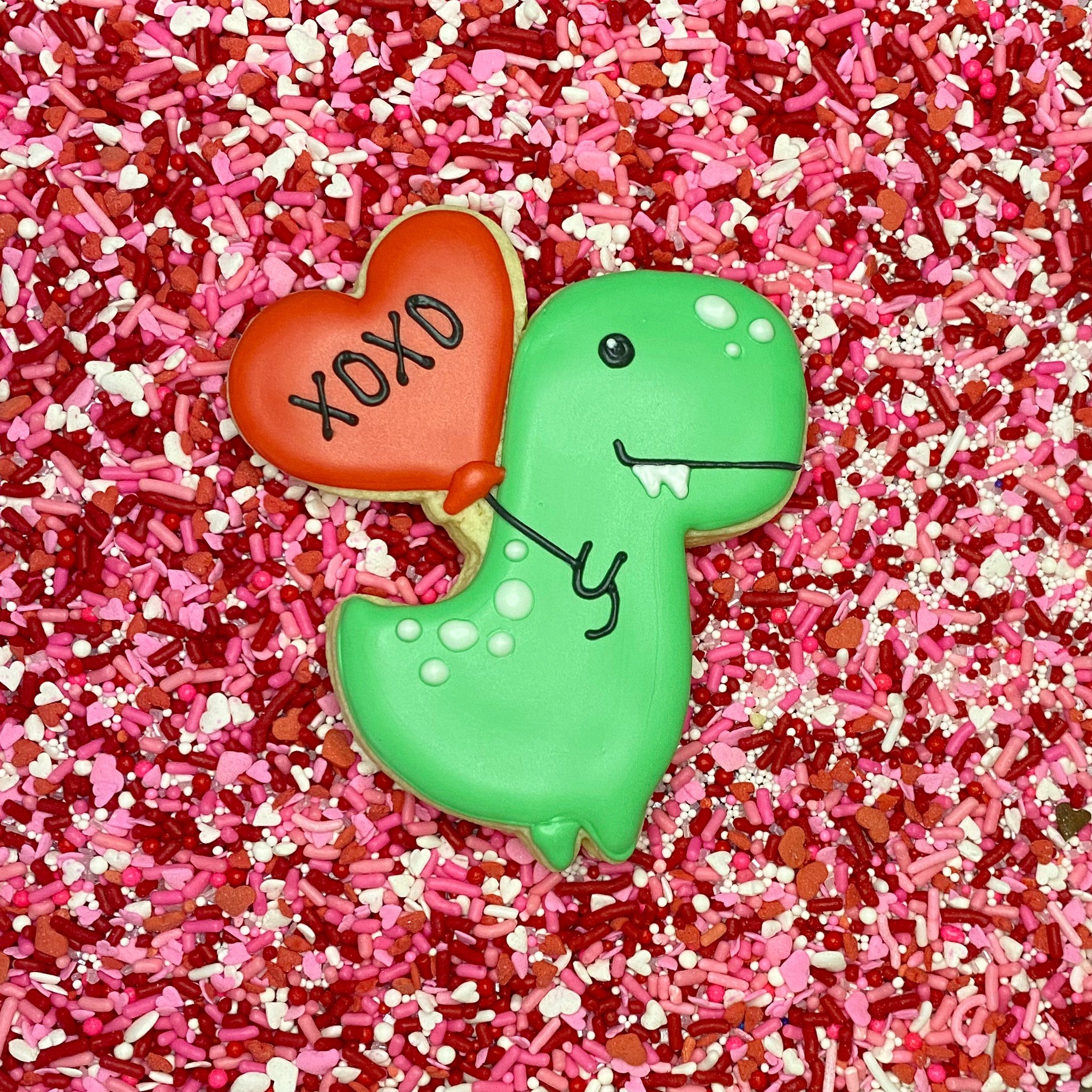 Two dinosaur buddies holding heart balloons with Valentines phrases (XOXO/Hugs/Cutie etc.) Perfect gift for a coworker, neighbor, friend, anyone who needs a little love!